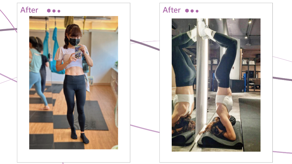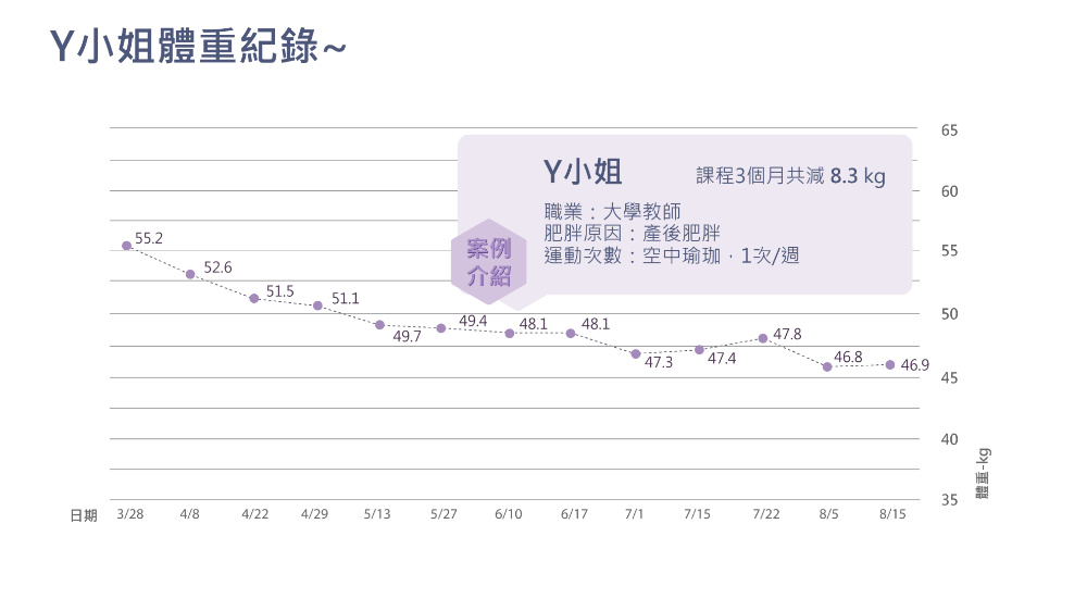 大學教授,在第二胎產後6個月餵母奶,體重仍無法下降,由我提供客製化飲食與生活調整。結果不但恢復身材,在4個月內瘦了8.3公斤,還愛上空中瑜珈,找到育兒、工作與身材維持的生活節奏。
