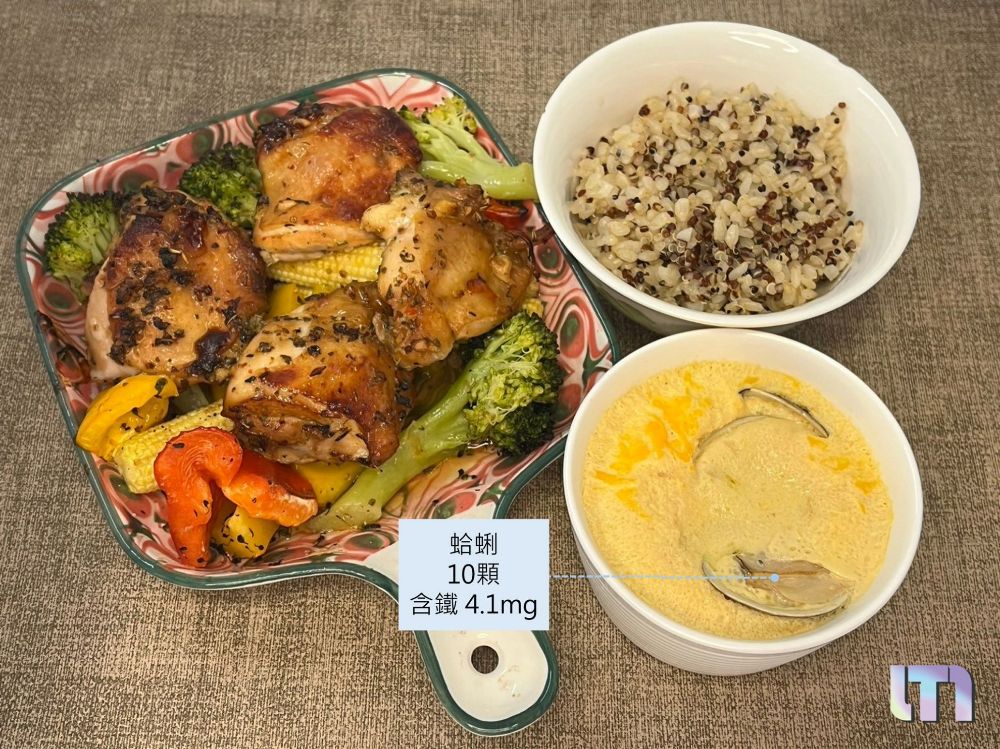 食材:雞腿肉、蛤蜊、雞蛋、蔥蔥雞湯、花椰菜、玉米筍、紅黃甜椒、藜麥、糙米、花椰菜米
